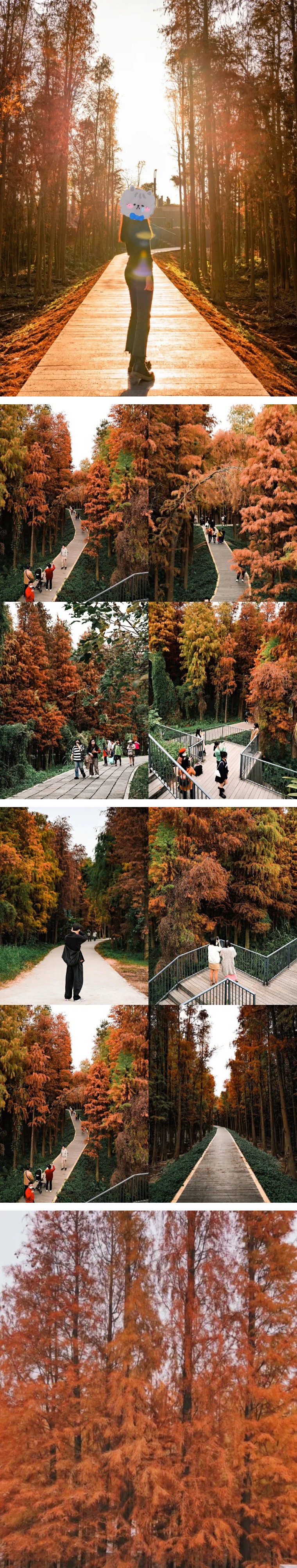 12:50 到达【石涧公园】,漫游小环线,挺拔的落羽杉披上了红装,宛如童话世界。漫步在水杉林亲水栈,享受小九寨的多彩风光