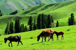成群的牛马在那惬意慵懒,交单漫步于一个个小山包之间是那般的自在悠闲