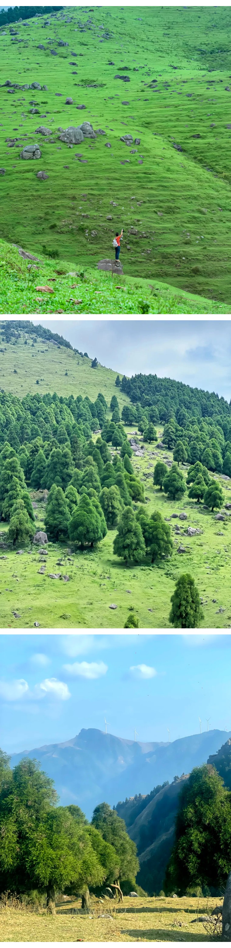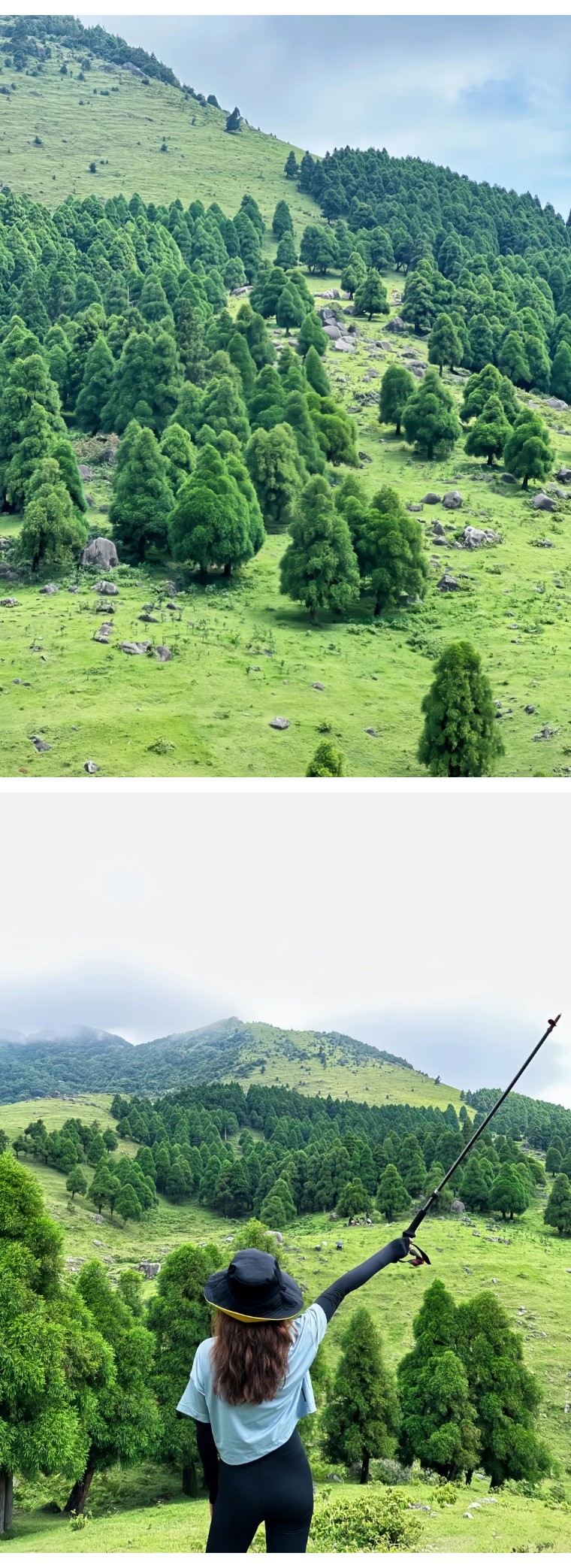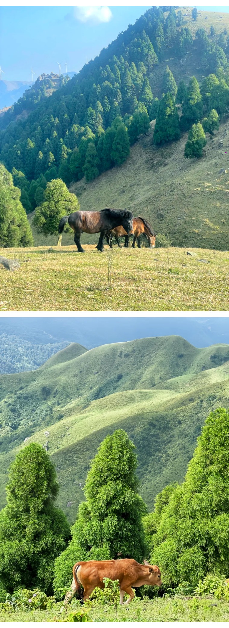 07:00 看完日出我们简单早餐后开始徒步广西的那拉提高山草原,随手一拍都很好看,山顶还有马和牛群,杉木林给六五顶披上了绿装,那一块两块零散的或是堆叠在一起的石头则是壤嵌在山体的翡翠宝玉。闭目暇想,气势磅礴的山体上,铺满茵茵绿草,似圣诞树的杉木错落有致地散布山上,各种奇型怪状的石头镶嵌其中,这大概就是传说中的欧陆风情吧