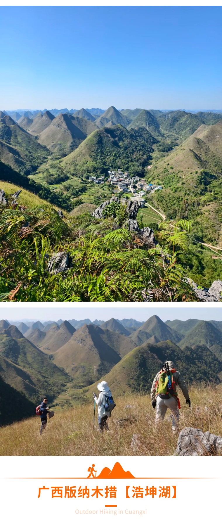 08:00早餐后出发,坐车1小时到达浩坤湖徒步起点,今天徒步网红浩坤湖穿越线,全程约13公里,爬升500米,徒步6小时左右。中午也是路餐干粮。这里也是广西山水经典的徒步景色