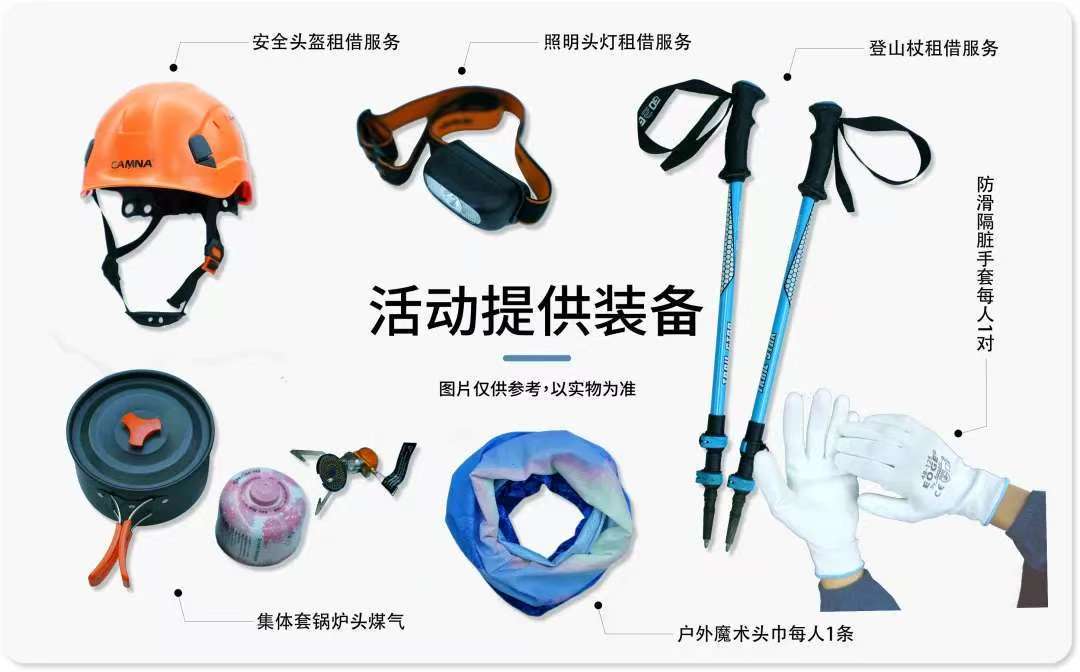 1.活动提供装备中说明的:探洞头灯、头盔/登山杖各一件免费使用。