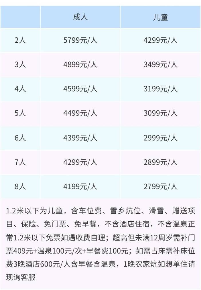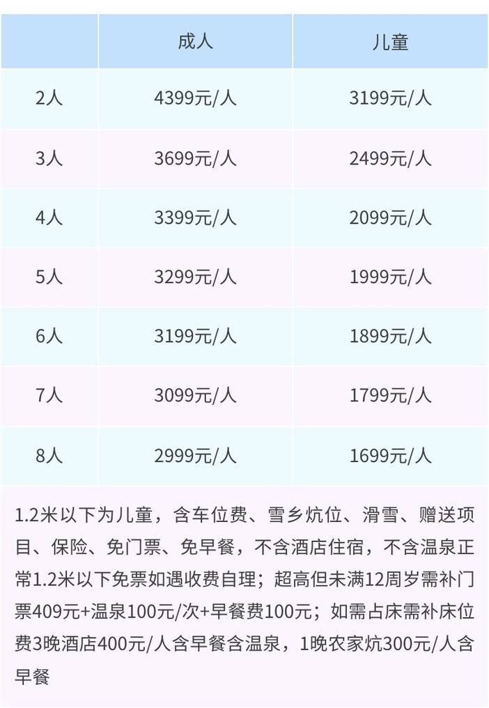 1.2米以下为儿童,含车位费、雪乡炕位、滑雪、赠送项目、保险、免门票、免早餐,不含酒店住宿、不含温泉;超高但未满12周岁需补门票409元+温泉100元/次+早餐费100元;如需占床需补床位费含早餐含温泉,请参考单房差费用。