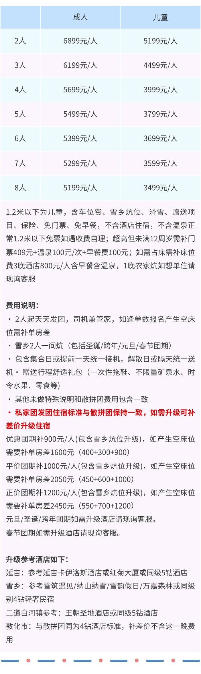 正价团期:3晚酒店 550元/人、1晚雪乡农家炕为4人间:1人包炕补1050元,2人包炕补700元,3人包炕补350元。4人包炕无需补差价。