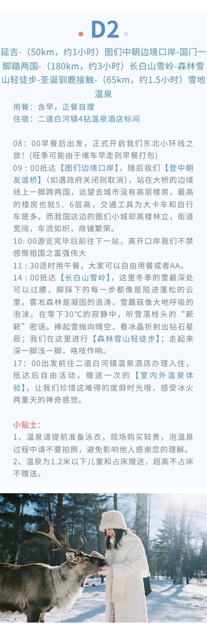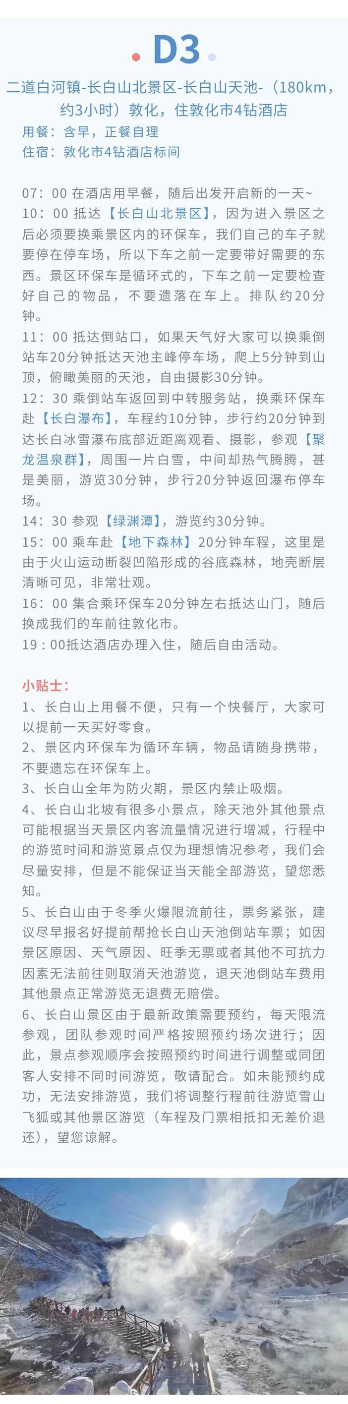 4、门票:图们中朝友谊桥门票、长白山雪岭门票、雪乡门票+往返环保车、长白山北景区全含(门票+往返环保车+摆渡车+天池倒站车)、雪乡滑雪3小时包含雪鞋雪板雪杖使用(滑雪时间从取雪具开始计算,到还雪具结束);
