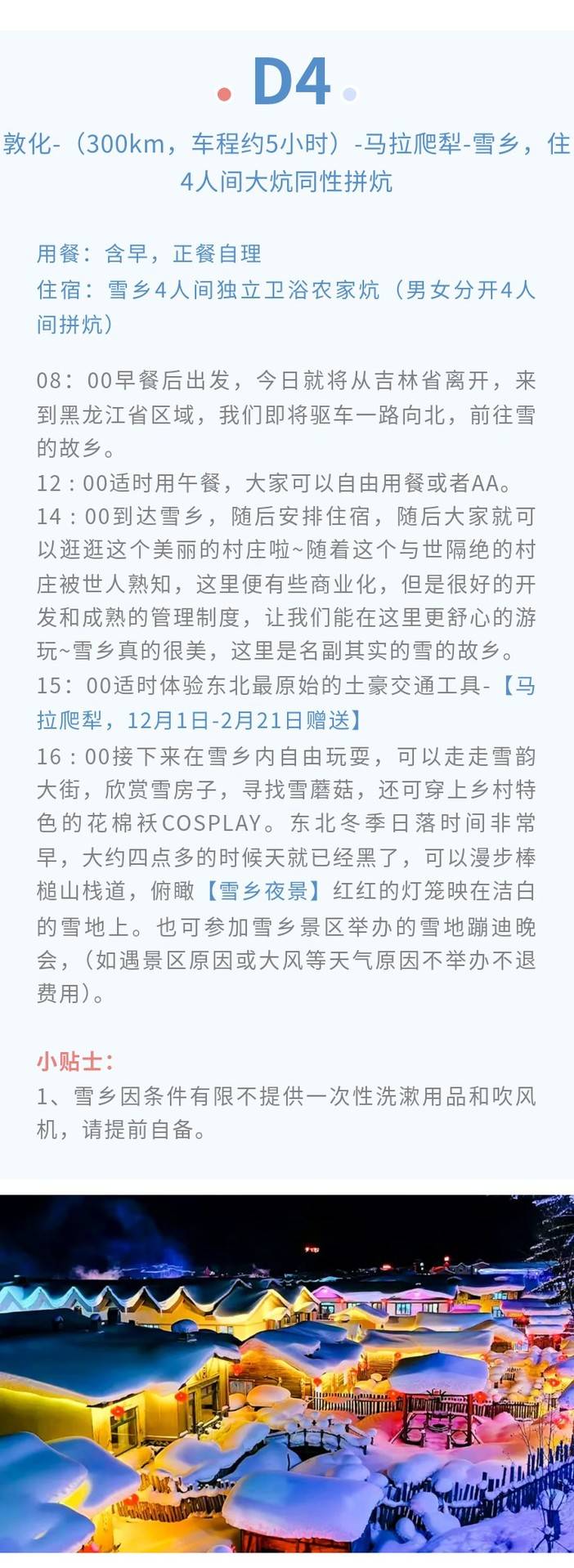 平价团期:3晚酒店 450元/人、1晚雪乡农家炕为4人间:1人包炕补900元,2人包炕补600元,3人包炕补300元,4人包炕无需补差价。