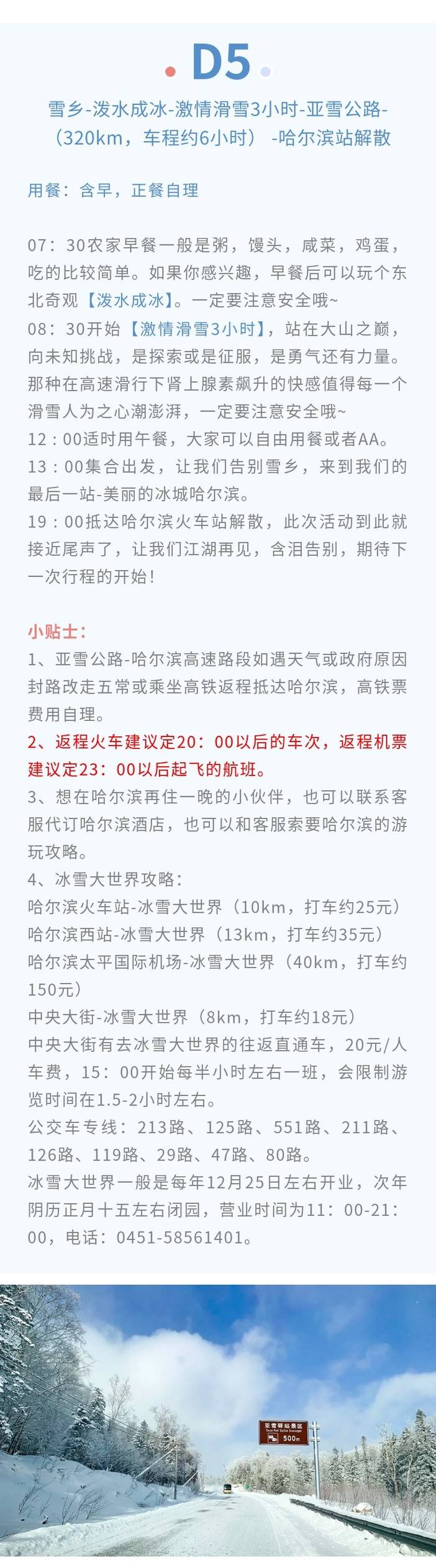 4、不含接送机,如需安排请最少提前2日和客服联系,哈尔滨接送机包车5座轿车150元/趟,夜航190元;7座商务车240元/趟,夜航290元/趟;夜航时间为21:00及以后-次日07:00及之前落地或起飞的航班,春节团期+50元/台车,包车费用以太平机场前往哈尔滨主城区定价(南岗区、道里区、道外区),如需包车前往其他区域请联系客服现询价;接机车辆非行程用车无空座。