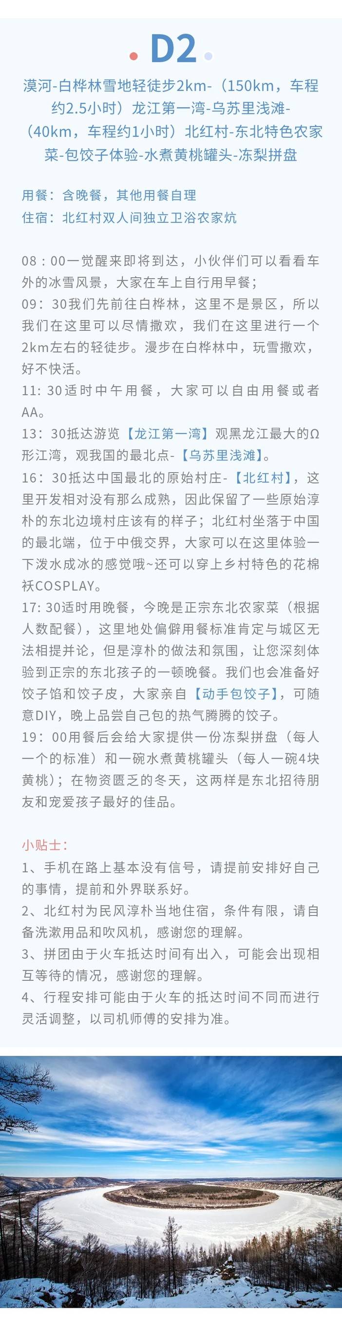 春节团期:漠河段2晚住宿补300元/人,补1晚哈尔滨住宿350元/人,1晚农家炕如想单住请现询客服;