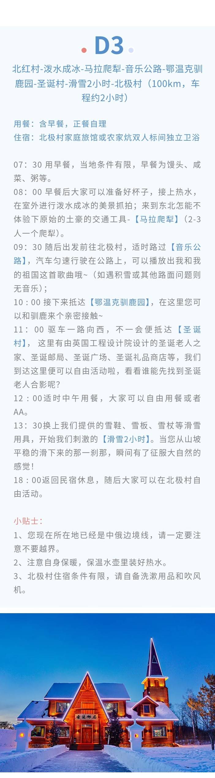 4、门票:雪乡门票+往返环保车、梦幻雪山门票、龙江第一湾门票、圣诞村门票、漠河2小时滑雪(包含雪鞋雪板雪杖)、北极村门票、鄂温克驯鹿园;
