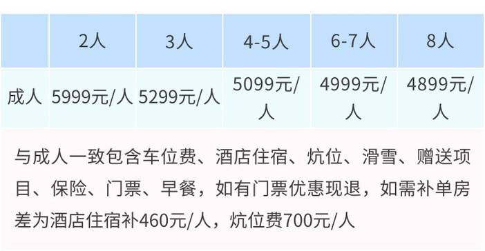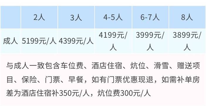 与成人一致包含车位费、酒店住宿、炕位、滑雪、赠送项目、保险、门票、早餐,如有门票优惠现退。