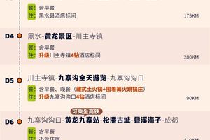 4、景交:黄龙索道上行80元/人+下行40元/人(建议乘坐)、黄龙观光车20元/人(可选),九寨沟观光车90元/人(必须),达古冰川观光车70元/人(必须)、往返索道180元/人(可选),毕棚沟观光车70元/人(必须)、电瓶车20-30元/人(分段计费、可选);