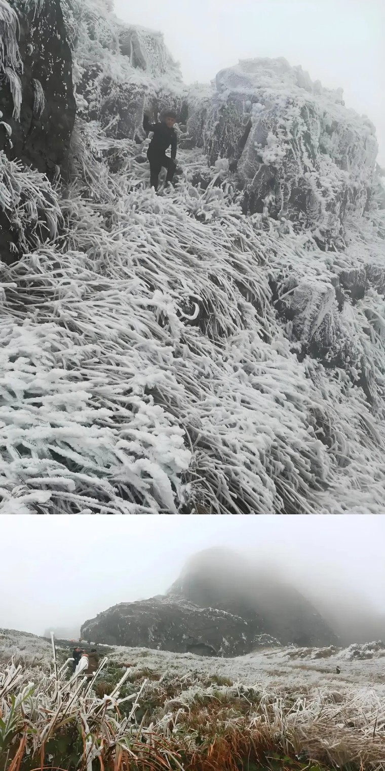 当寒潮席卷时,大圣山又展现出别样的风姿。海拔1170米的大圣山是横县出现雪淞、雾凇机率最大的地方。山上的雪淞、冰挂不断给人惊喜,晶莹剔透的冰花挂在树枝上,奇特的冰花雾凇景观宛如冰雪王国。