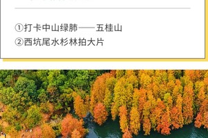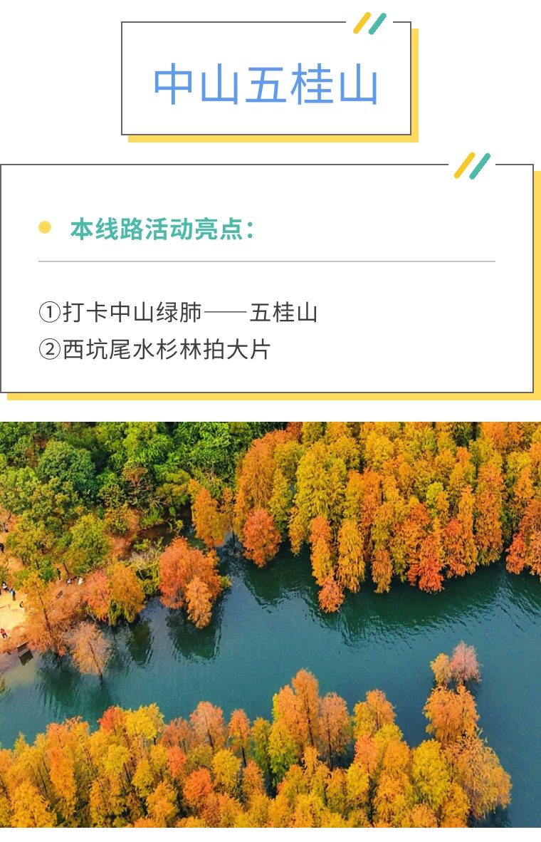 五桂山,被称作中山绿肺,古称“香山”,因盛产沉香而得其名。水库中有大片植物活化石-水杉,山上错落着大小不一的枫树林。秋高气爽之季是一年中最美的时候。