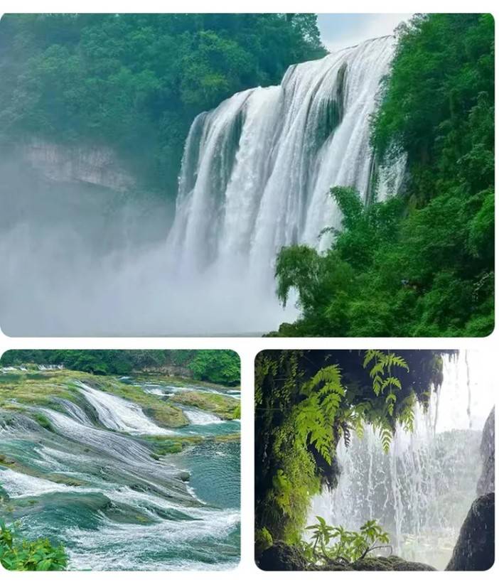 【陡坡塘瀑布】“吼瀑”、西游记黄果树瀑布群中最宽的瀑布,是一个高21米、宽达105米的天然坝型瀑布,平水时,水流清澈,瀑布水层沿着和缓的瀑面,均匀地撒开,如一层薄薄的、半透明的面纱,又如一面面张开的素绢扇面,在阳光下泛着银光,故有人戏称为“新娘面纱”。但当洪季来临,白水河中由于携带了大量山洪冲下来的泥沙而呈土黄色,陡坡塘瀑布便消失了往日平水时的秀色,而变得异常凶猛雄壮。 这里也是《西游记》中唐僧师徒四人牵马过河的取景地。
