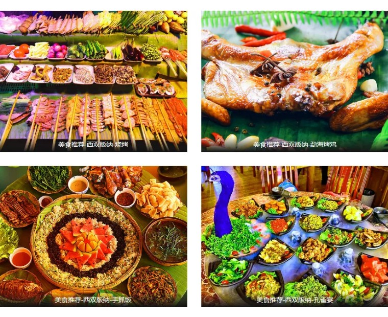 西双版纳不仅景色闻名,美食更是众多,西双版纳有着著名的美食小吃和烧烤,泼水粑粑,水腌菜老奶洋芋,香茅草烤鱼,特色竹虫,烤五花肉、猪皮,舂生牛肉、傣味撒撇,特色牛扒乎、傣味菠萝饭、芭蕉花,酸笋牛肉、包烧鱼、柠檬干巴、竹筒饭、柠檬舂鸡脚、柠檬凉鸡、柠檬肉皮、蹄筋;