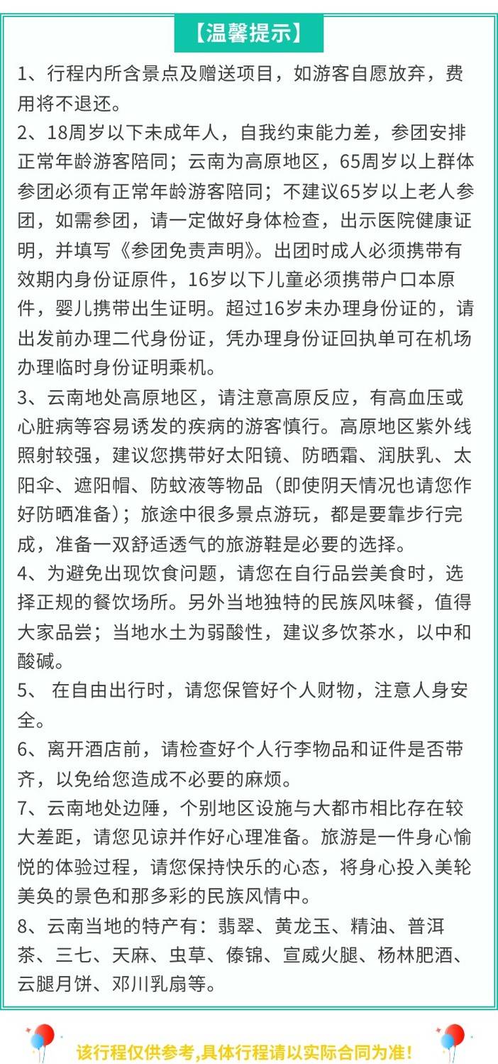 由于云南地处高原,海拔较高,对65岁以上年龄的老人及心脏病、冠心病、高血压等身体欠健康的人群我社不予接待,请组团社一定提醒客人所存在的风险,若客人执意参团则按成本收取,若在团上因以上原因造成的一切后果我社概不承担,谢谢配合!!!