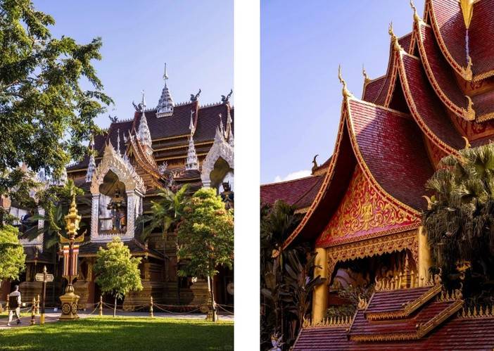 从山门至万佛塔,佛祖释迦牟尼的生平巧妙的融入到景观和建筑中,使得每处细节都有说法、故事,从万佛塔广场俯视景洪市区,旖旎的热带风光尽收眼底。