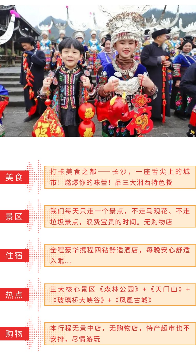 3、幼童:6岁以下,费用不含床位、不含高铁票;含当地车位、导服、正餐、保险;景区门票免费,若因超龄产生费用自理,凤凰古城沱江泛舟50元/人需自理。