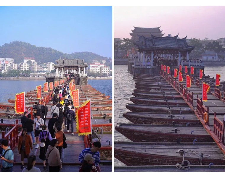 每天10点左右,广济桥会上演一幕“拼船搭桥”,而到下午5点的时候,又会上演一幕“过河拆桥”。