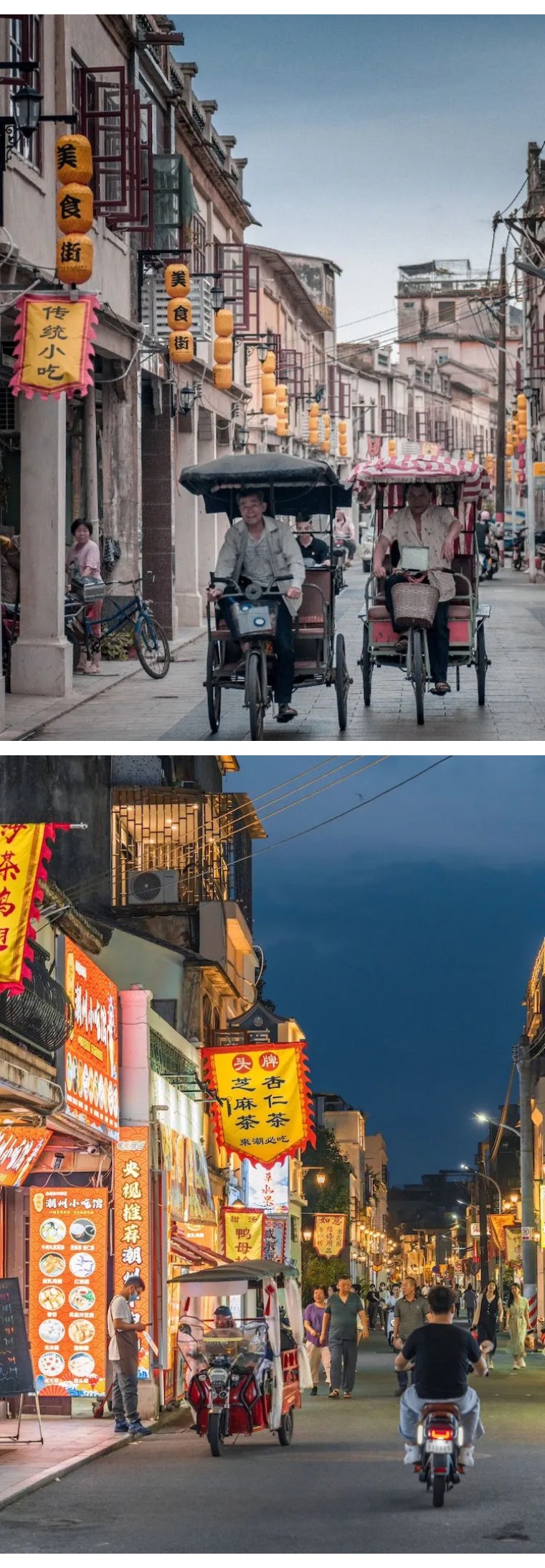 白天的时候可以去与牌坊街相间的多个古巷里面走街串巷扫街,这里有潮州文化最为纯粹的缩影。晚上来,灯光下的牌坊街更绚丽。